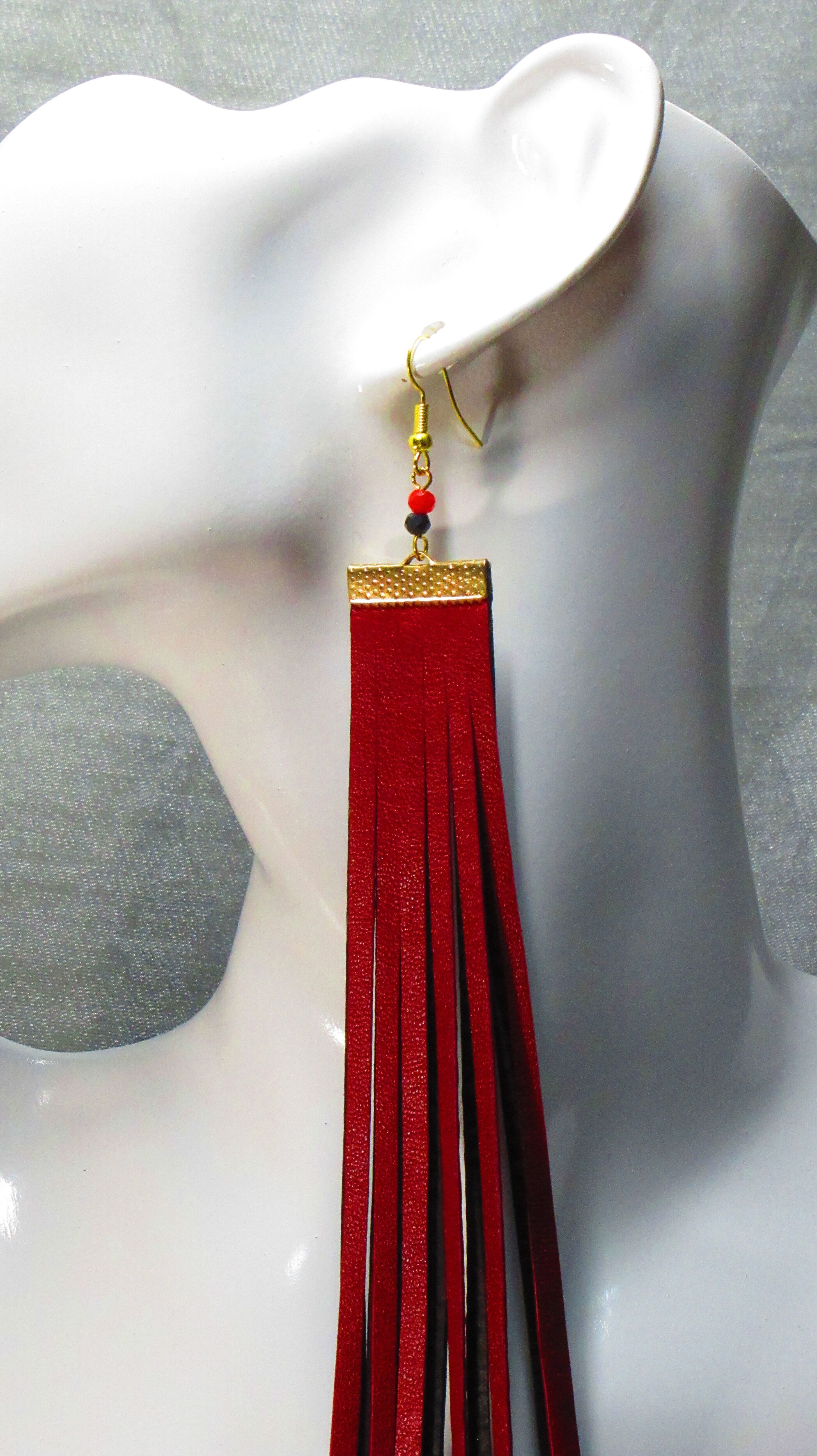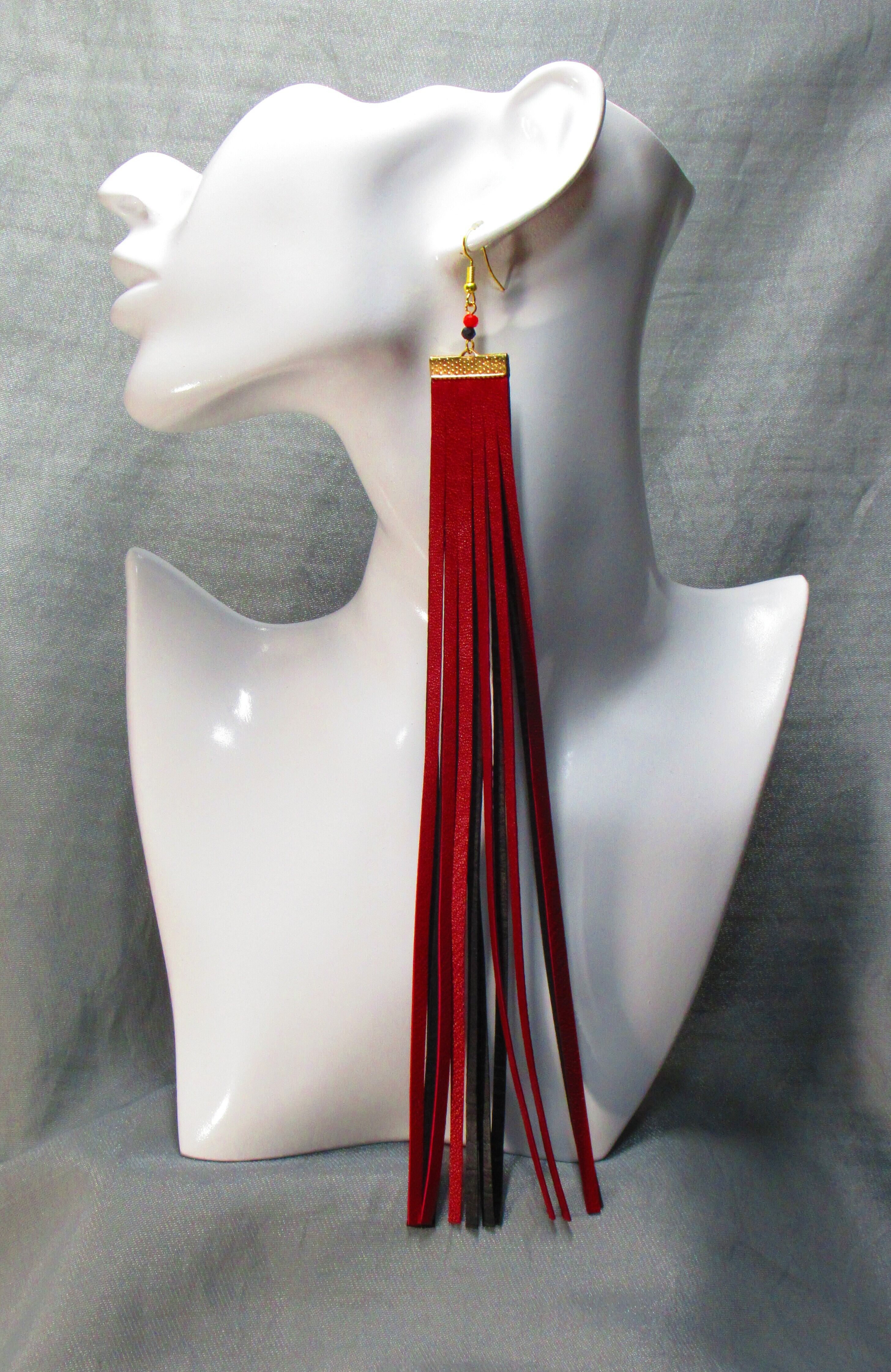 赤黒レザーロングフリンジピアス(金具ゴールド)